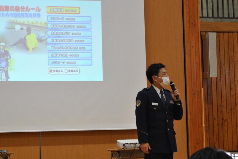 千曲警察署から警察官の方に来ていただいて、自転車交通安全についてのDVDを見たり、4月から努力義務化している自転車運転者のヘルメット着用についてお話しいただいたりしました。