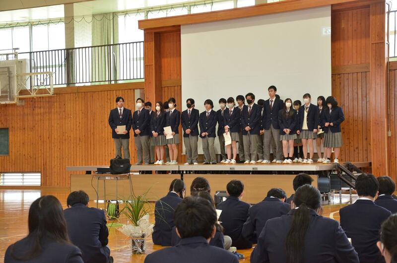 坂城男女共同みんなの会が主催する「女と男かがやき川柳」に、今年も坂高1年生が応募し、1作品が会長賞、2作品が町長賞、1作品が教育長賞、3作品が優秀賞を受賞しました。本校でその授賞式が行われ、賞状と記念品を授与していただきました。