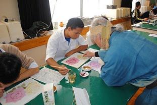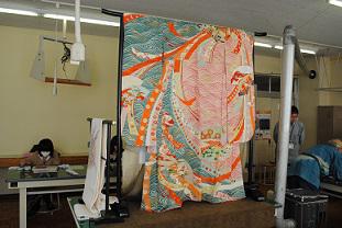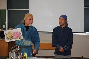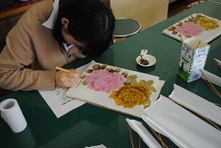 ハンドクラフト(3年生選択)の授業で、染色分野の「信州ものづくりマイスター」・林部貢一さんと息子さんの彦太さんをお招きし、手書き友禅の授業が行なわれました。「信州ものづくりマイスター」は、長野県の派遣事業として、後継者育成のために中学生や高校生が専門家の指導を直接受けられる貴重な機会です。通常の授業時間を大幅に超えて指導を受けましたが、生徒たちは集中して最後まで取り組んでいました。伝統工芸にふれる良い体験となりました。