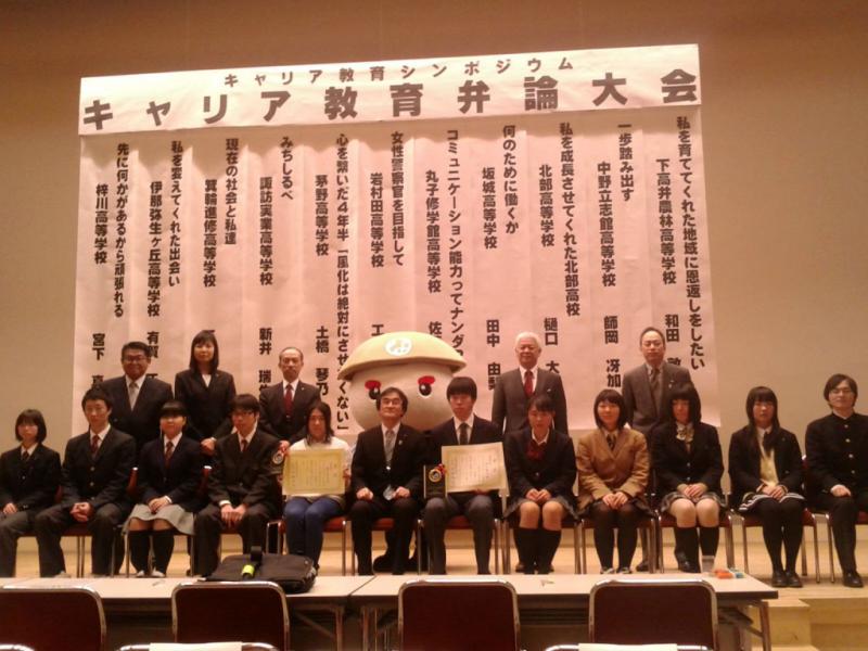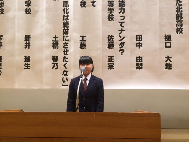 本日(1月16日)、ホクト文化ホールで開催された、「キャリア教育弁論大会」に、本校2年田中由梨さんが出場し、「何のために働くか」と題して発表しました。表彰式で最優秀賞、優秀賞2名の発表のあと、県教育委員会の菅沼教育次長から、「弁論という伝え方の観点と、キャリア教育の内容の観点と双方で審査するのは難しい。個人的感想だが、キャリア教育の観点から見れば、坂城高校の田中さんの内容が良かった」とのお言葉がありました。自然体で素晴らしい発表でした。