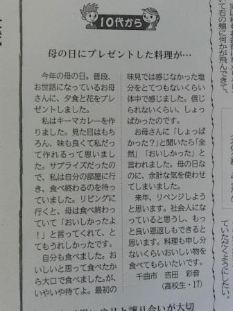 8月28日日曜日の信濃毎日新聞「10代から」のコーナーに本校3年吉田彩音さんの作文が掲載されました。母の日にサプライズ。お母さんも嬉しかったことでしょう。でも少しお母さんに気を遣わせてしまったようです。