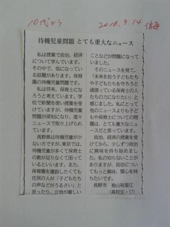 9月14日水曜日の信濃毎日新聞「10代から」のコーナーに本校3年袖山裕里江さんの作文が掲載されました。新聞で学ぶ政治経済で、待機児童問題から、政治に関心が深まったようです。