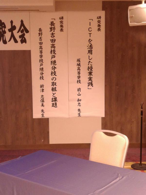 本日(9月24日)、ホテル信濃路で開催された「長野県高等学校教育研究会北信地区総会・研究大会」において、本校の前山和志先生が、「ICTを活用した授業実践」と題して、生徒の興味を引き出すために日々工夫している授業実践の発表をしました。北信地区の校長・教頭先生方をはじめ、多くの先生方から称賛の言葉をいただきました。