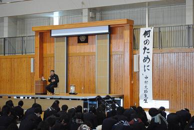 昨日で、3年生の卒業試験が終了し、本日午後、進路講演会を開催しました。日本中で講演活動を行っている中村文昭先生が「何のために」と題した講演をしてくださいました。ご多忙な方ですが、その合間を縫って、本校の生徒のためにご来校いただきました。中村先生の波乱万丈の人生と、そんな中で自分が師匠と呼べる人と出会い、人生が思いもよらぬ方向に進んだこと、モットーとしているのは、師匠から教わった「頼まれごとは、試されごと」、人に喜ばれることをすることが幸せにつながることなど、話しをしていただきました。生徒も心をうたれたようです。