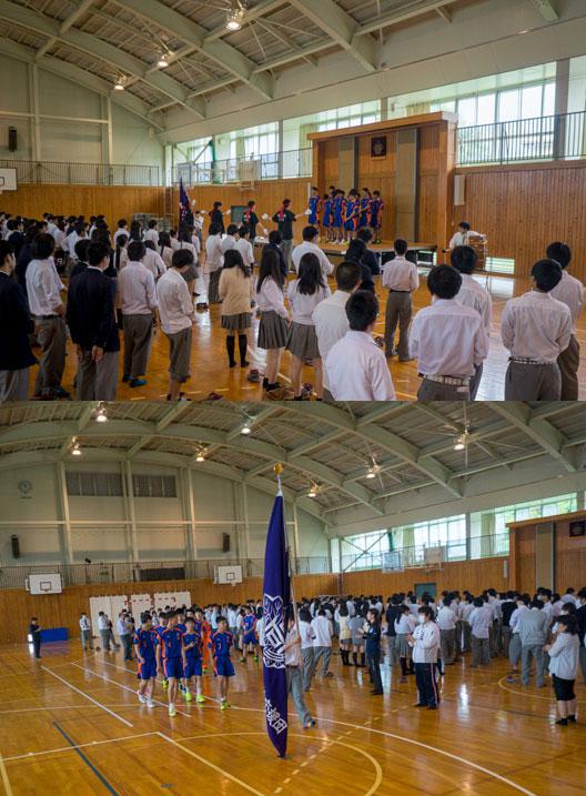 5月28日(月)、6月より始まる長野県高校総体へ出場するクラブの壮行会が体育館で行われました。本校からは、男子ハンドボールチームが参加します。県大会での飛躍を期待して、全校でエールを送り、校歌を斉唱しました。