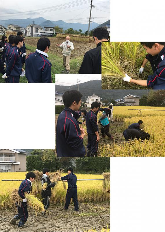 この体験は、本校同窓会理事をお願いしている鈴木様のご協力により実現したもので、生徒たちは、自分たちが6月に植えた苗が、たわわに実った稲穂に生長していることに驚きながら、刈り取りの方法や束ね方、はぜかけの手順などご指導いただき、泥まみれになりながらも、怪我もなく時間内に作業を終了することができました。