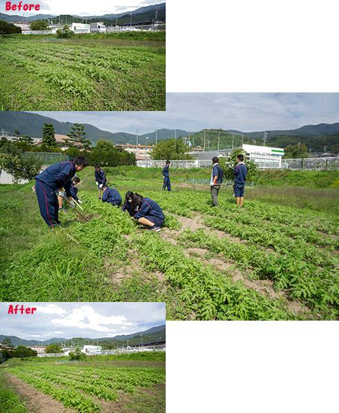 10月5日(金)4時間目に、3年生選択生物の受講者が過日(9月4日)に種まきをしたねずみ大根畑の草取りをしました。