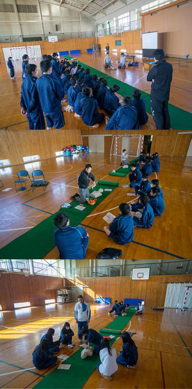本校では、毎年1年生に対し、このような講習を行うことで、生徒全員が救命救急への対応力を身につけていただくように取り組んでいます。