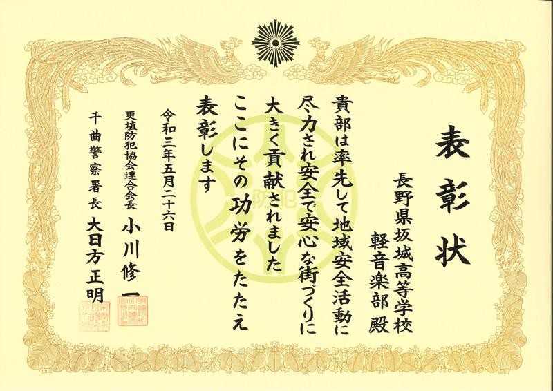 本校 軽音学部は、ここ数年、自転車盗難防止ソングの制作、演奏をつうじて地域に貢献してきましたが、この度、千曲警察署様、更埴防犯協会連合会様から表彰していただきました。