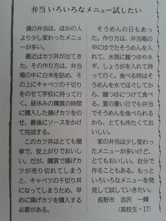 8月20日土曜日の信濃毎日新聞「10代から」のコーナーに本校3年 吉澤一輝君の作文が掲載されました。ユニークな作文の中に、毎日お弁当を作ってくれるお母さんへの感謝の気持ちが感じらます。