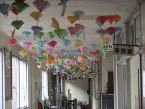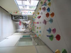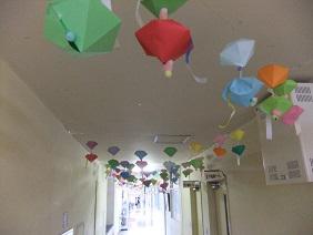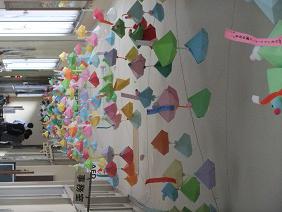 全校生徒と先生方が、厚紙で作ったダイヤモンドは700個以上。それぞれに願い事を書いた短冊を貼り、つなぎ合わせて、1棟1階の廊下を彩っています。ご覧ください。