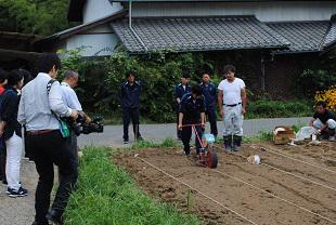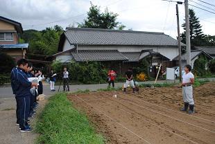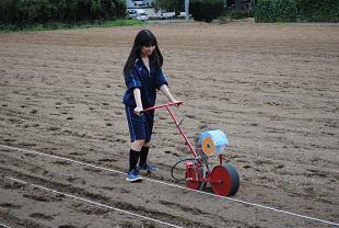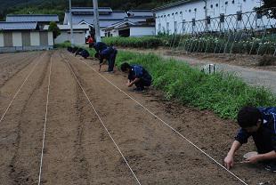 今年も、町の方々にご指導いただき、坂城町の特産品「ねずみ大根」の播種の実習を行いました。普段畑にはあまり縁のない生徒達ですが、土に触れて何かを感じ取ってくれたことでしょう。これからの社会を担う生徒たちにとって、生物の授業としてのこの体験は、社会に貢献するということがどういうことなのかを学ぶ、貴重な機会にもなっていると思います。