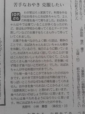 9月3日、信濃毎日新聞朝刊の「10代から」のコーナーに、本校の3年生、小林舞香さんの作文が掲載されました。「苦手なおやき 克服したい」と題して、おばあちゃんの作ってくれる料理に対する感謝の気持ちが書かれており、家庭の温かい雰囲気が伝わってきます。