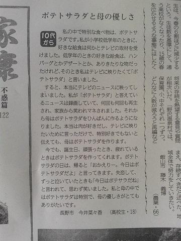 また、9月4日は、同じく3年生の 今井菜々香さんの作文が掲載されました。母子の間では、特別なポテトサラダ。お互いのやさしさがにじみ出ている作文だと思います。