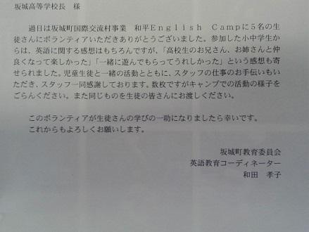 夏休みに本校の有志5名が参加した、坂城町の子ども英語キャンプのボランティアに対し、町の担当の方からお礼の手紙とその時の写真が届きました。地域に貢献する活動に感謝の気持ちがつづられていました。まさに心が研かれる活動が少しずつ評価されていきます。