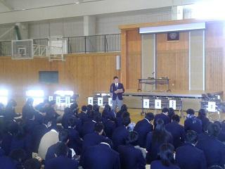 昨日で、3年生の卒業試験が終了し、本日午後、進路講演会を開催しました。日本中で講演活動を行っている中村文昭先生が「何のために」と題した講演をしてくださいました。ご多忙な方ですが、その合間を縫って、本校の生徒のためにご来校いただきました。中村先生の波乱万丈の人生と、そんな中で自分が師匠と呼べる人と出会い、人生が思いもよらぬ方向に進んだこと、モットーとしているのは、師匠から教わった「頼まれごとは、試されごと」、人に喜ばれることをすることが幸せにつながることなど、話しをしていただきました。生徒も心をうたれたようです。