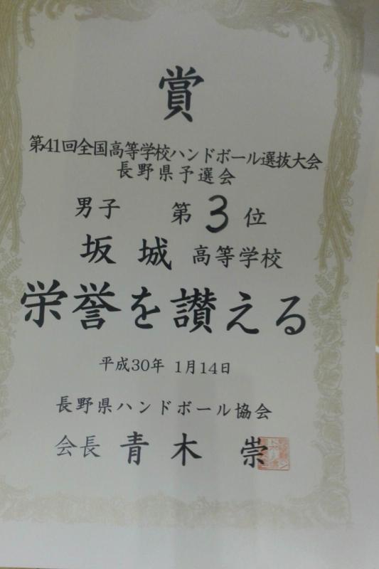 1月13、14日、戸倉体育館で開催された「全国高等学校ハンドボール選抜大会長野県予選」で、ハンド部が3位になりました。新人戦で県ベスト4のチームのみが出場し、リーグ戦で戦いました。屋代高校と長野南高校には残念ながら敗れましたが、上田染谷丘高校には接戦のうえ、1点差で勝利し、3位を決めました。2年生の村田くんが優秀選手賞を獲得しました。1試合ごとに、チームのいいところが出てきて、来年度の春に向けて、収穫の大会となりました。