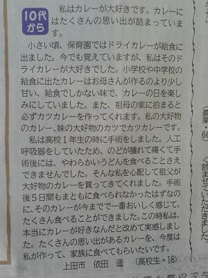 1月16日の信濃毎日新聞朝刊の「10代から」のコーナーに、3年生の依田遥さんの作文が掲載されました。カレーが大好きなことを知っっている家族の温かさ、給食でのドライカレーが楽しみだったこと、病気で食べれなかったあとのカレーの味など、カレーから思い出されることや、いろいろな思いが伝わってきました。