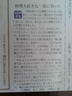 今年度、多くの作文が信濃毎日新聞に掲載されました。「10代から」のコーナーで、今年度最後の掲載は、3年4組の岩下飛翔くんの作文です。「料理大好きな一家に育って」と題したもので、おいしい料理を毎日食べて、幸せを感じる作文です。
