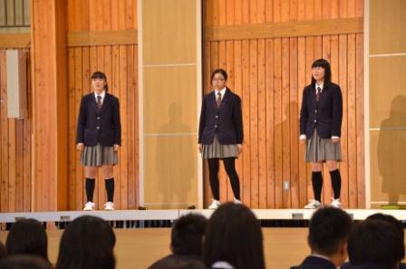 1年生3名の参加で、伴奏も無しで本人たちだけでのステージとなりました。不安な気持ちも大きかったと思いますが、堂々と美しい歌声をホールに響かせてくれました。
