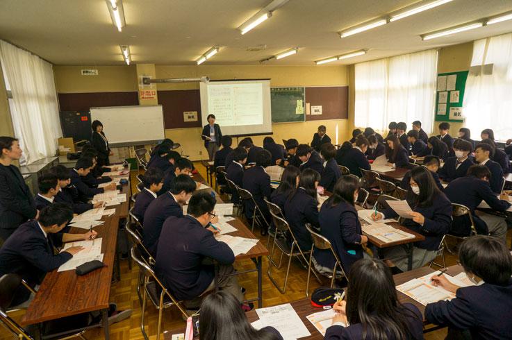 参加した3年生は、それぞれに相談しながらワークシートに取り組み、結果の分析について、講師の方の説明を真剣に聞いていました。
