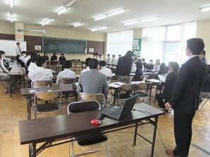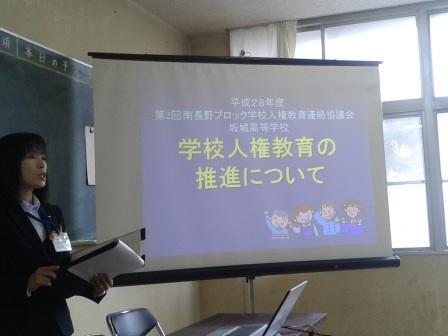 本日、本校を会場に南長野ブロック人権教育連絡協議会を開催いたしました。北信教育事務所の野田久美子指導主事のご指導のもと、全校生徒が人権映画「アンダンテ 稲の旋律」を鑑賞し、それぞれが感じたことをHRにてグループで意見交換しました。全クラスの授業を公開し、近隣の小中高の先生方や行政の人権担当の方、地域の人権擁護委員の方など20名近い方々のご参観いただき、本校の人権教育についてご意見をいただきました。