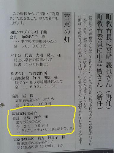 「広報 さかき」7月号に、本校生徒会が「子どもフェスティバル」で焼き鳥を販売した際の売上、24,998円を寄付をしたことが掲載されています。まちづくりのために活用いただきます。