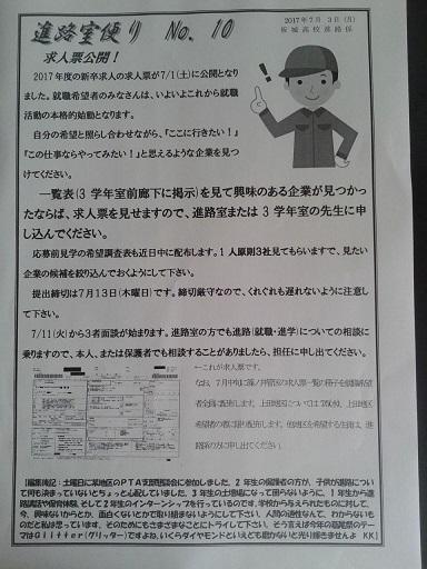 新規卒業者の求人票が、7月1日に公開となりました。就職希望の生徒はいよいよ本格的に就職活動が始まります。じっくり考え、しっかり見学し、保護者や先生方と相談して、自分で決めていきましょう。各企業から、有用とされる人間になるために、残りの高校生活の中で、やるべきことをやり、苦しいことから逃げず、人のためになる活動をしていってください。頑張れ3年生。