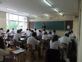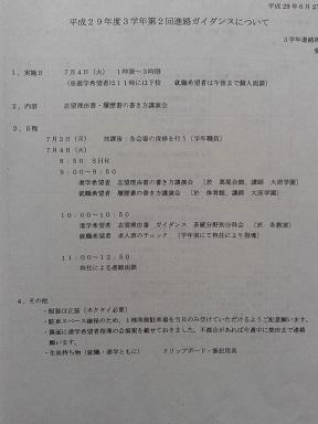 本日、4時間目のLHRで、3年生は第3回進路ガイダンス(その1)を行いました。今回は、大原学園から4名の講師の方に来ていただき、各クラスごとに、面接や社会のマナーなどについて、熱くご指導いただきました。暑い中ありがとうございました。生徒も真剣なまなざしで聞いていました。さすが3年生。(その2)は7月24日に行います。