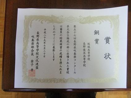 7月30日に伊那文化会館で行われた「第57回長野県吹奏楽コンクール県大会」で、本校吹奏楽部は銅賞をいただきました。本校吹奏楽部は3年の遠藤彩音さんと1年の宮下桃花さんの2名だけですが、今回のコンクールは、長野俊英高校と合同で参加しました。総勢7名の少人数B編成の部への出場でした。これまでコンクールに向けて、長野俊英高校に行って練習を重ねてきました。少ない中でも、心を込めた演奏ができたと思います。
