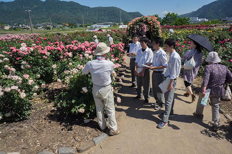 選択生物の授業では、今後、地域の方のご協力の下、バラの挿し木実習と栽培を計画しています。今回の実習は、そのための事前学習として、バラ祭りの会場で、実習の講師をしていただく地元の方に説明をいいただきながら、見学と観察を行いました。